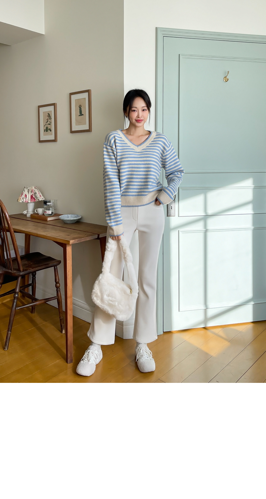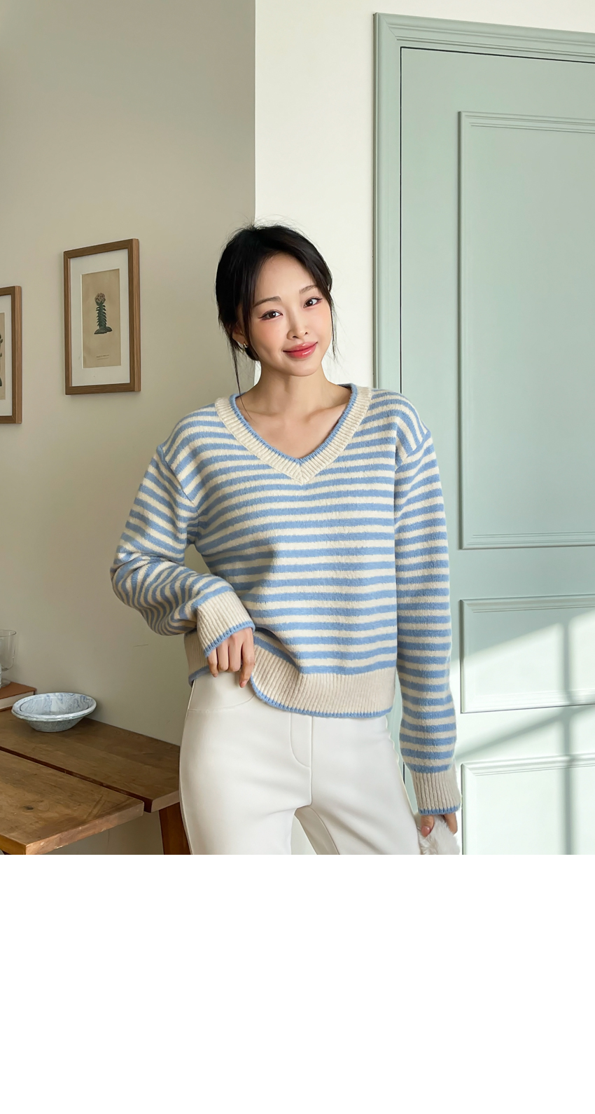 韓國製V領橫間條長袖衫(天藍/啡/炭灰)