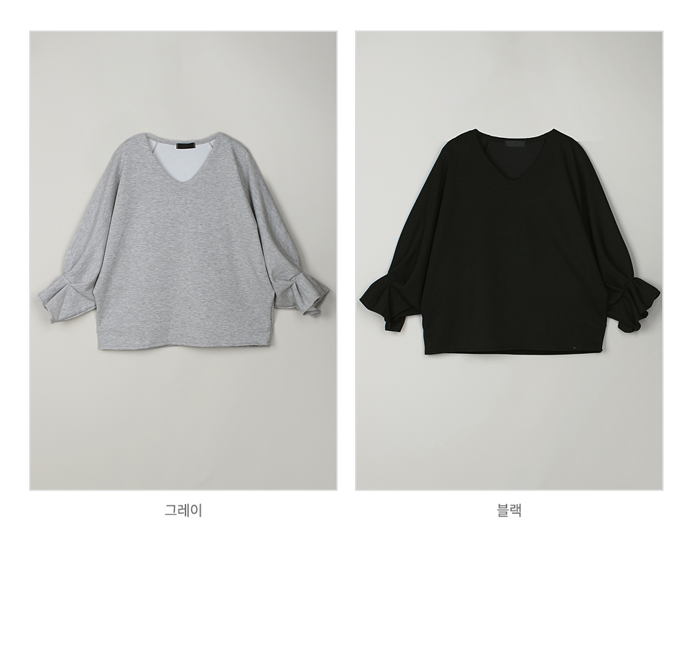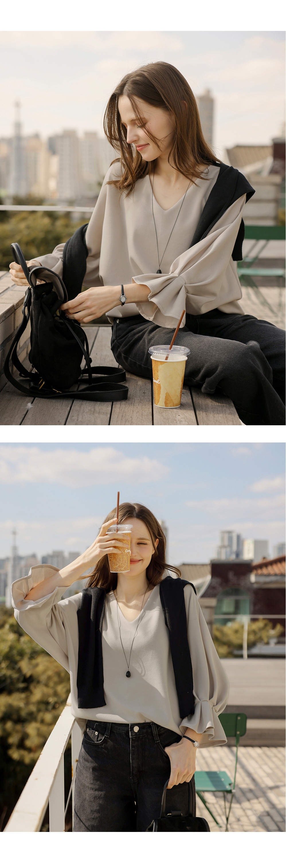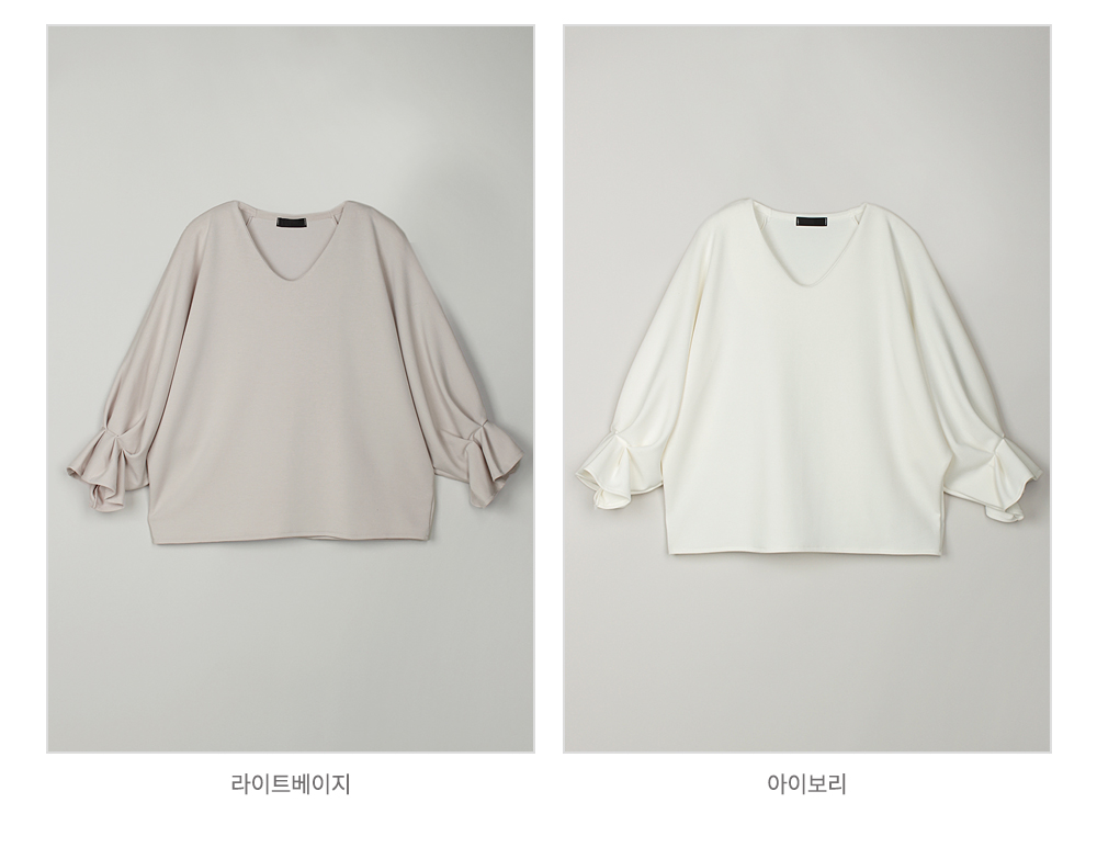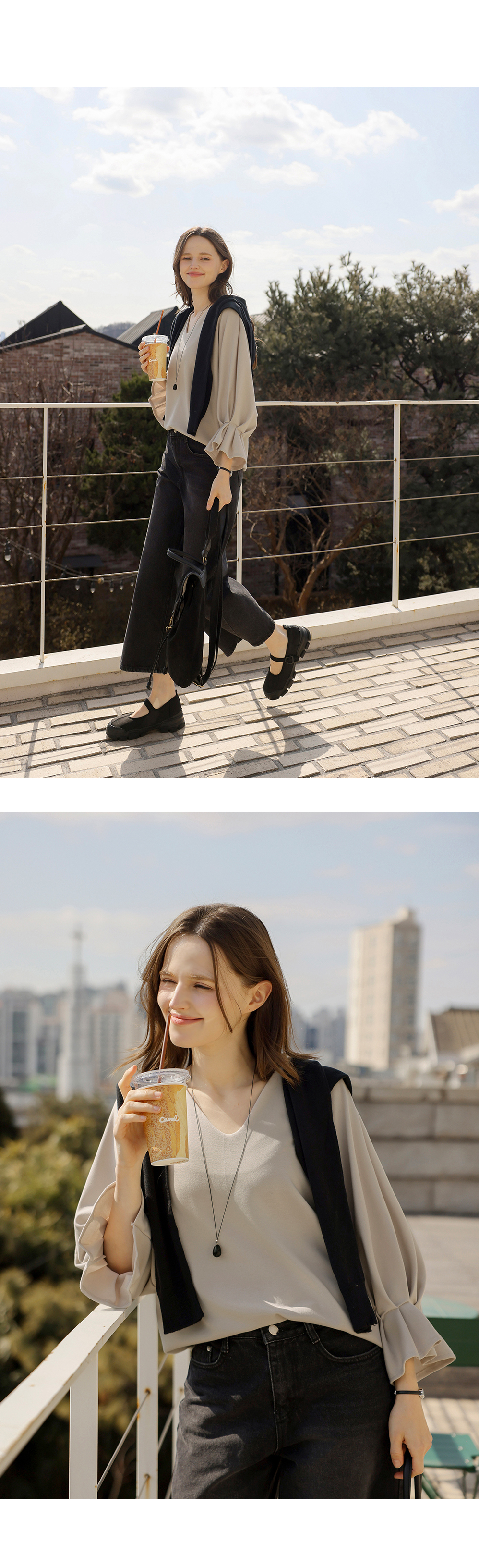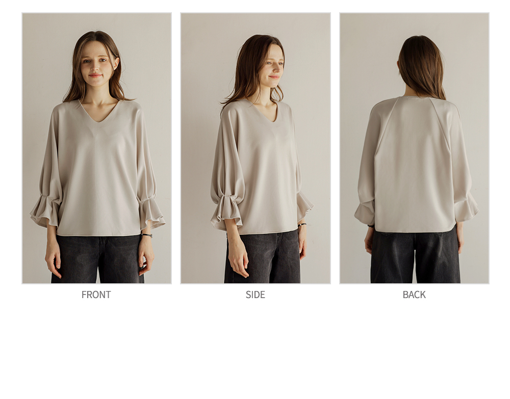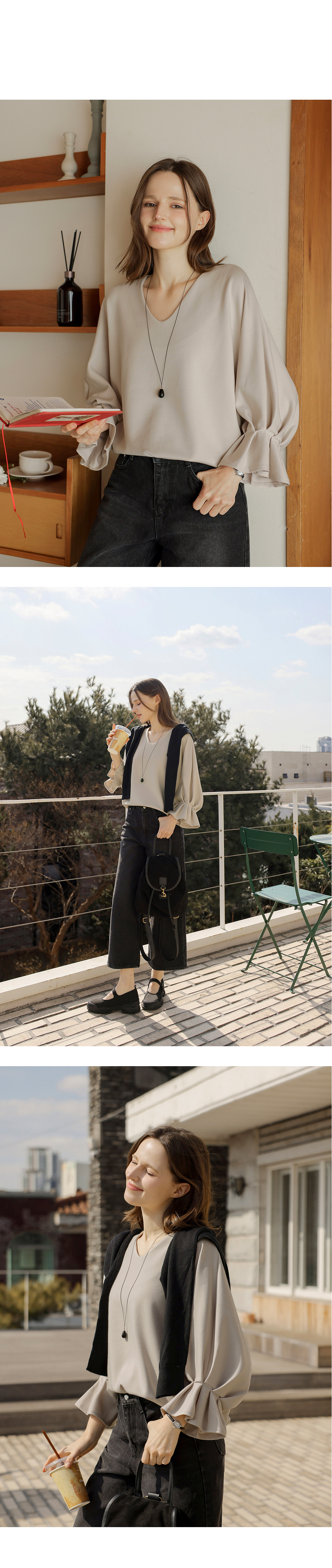 韓國製荷葉褶袖優雅V領長袖衫(黑/白/米/灰)