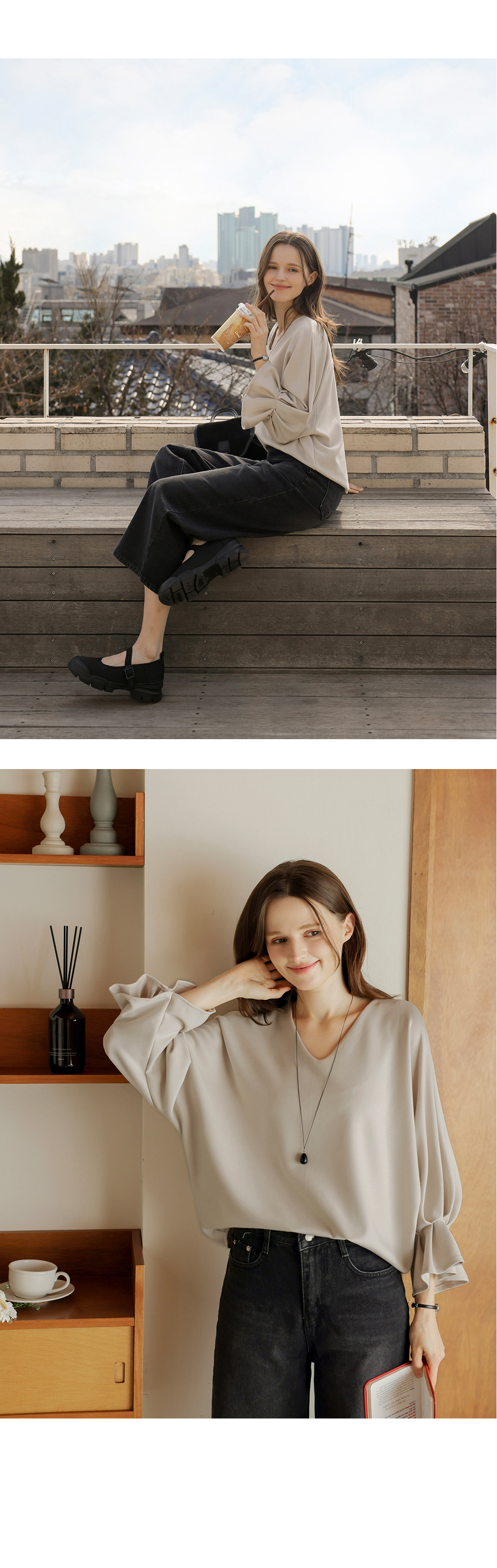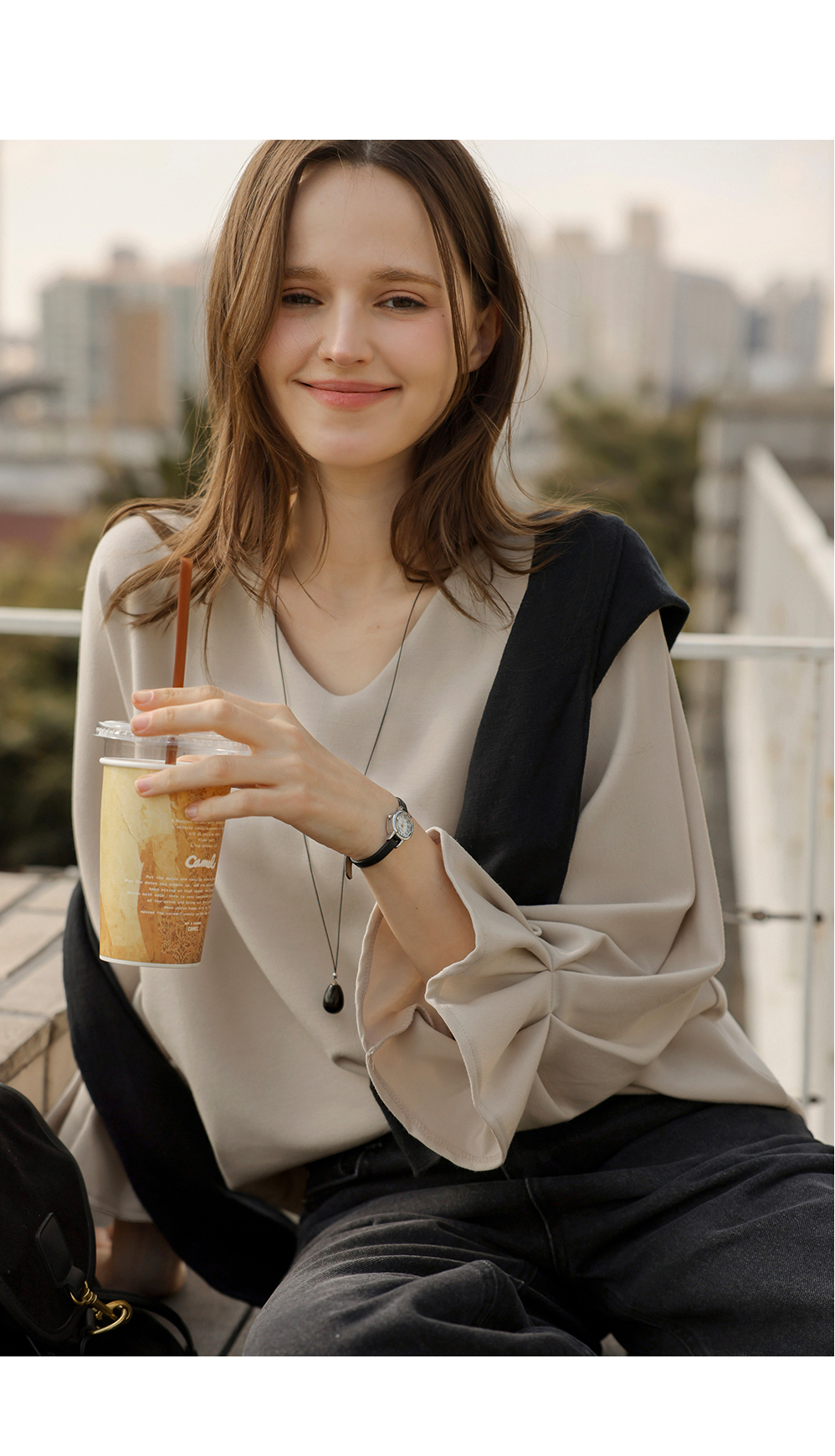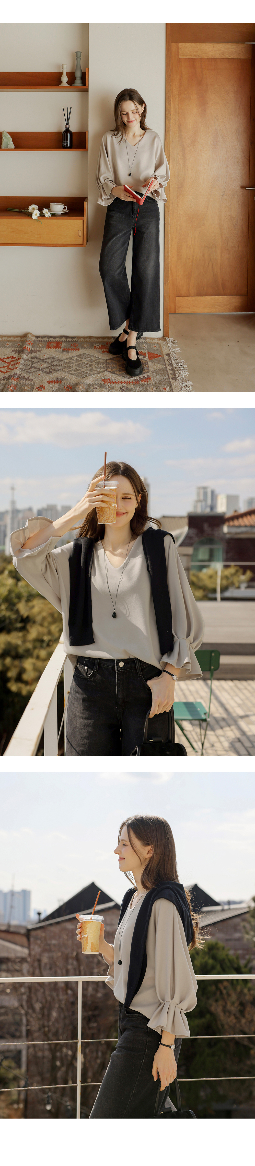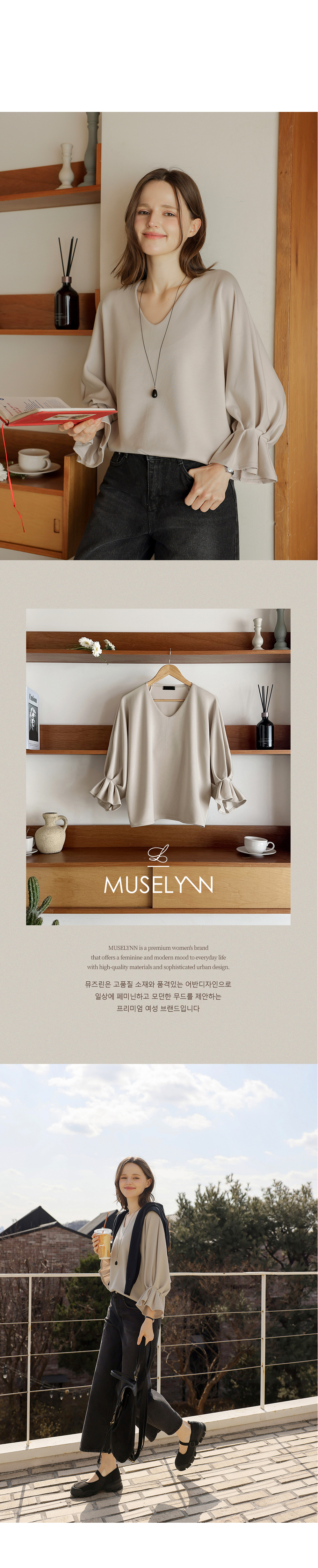 韓國製荷葉褶袖優雅V領長袖衫(黑/白/米/灰)