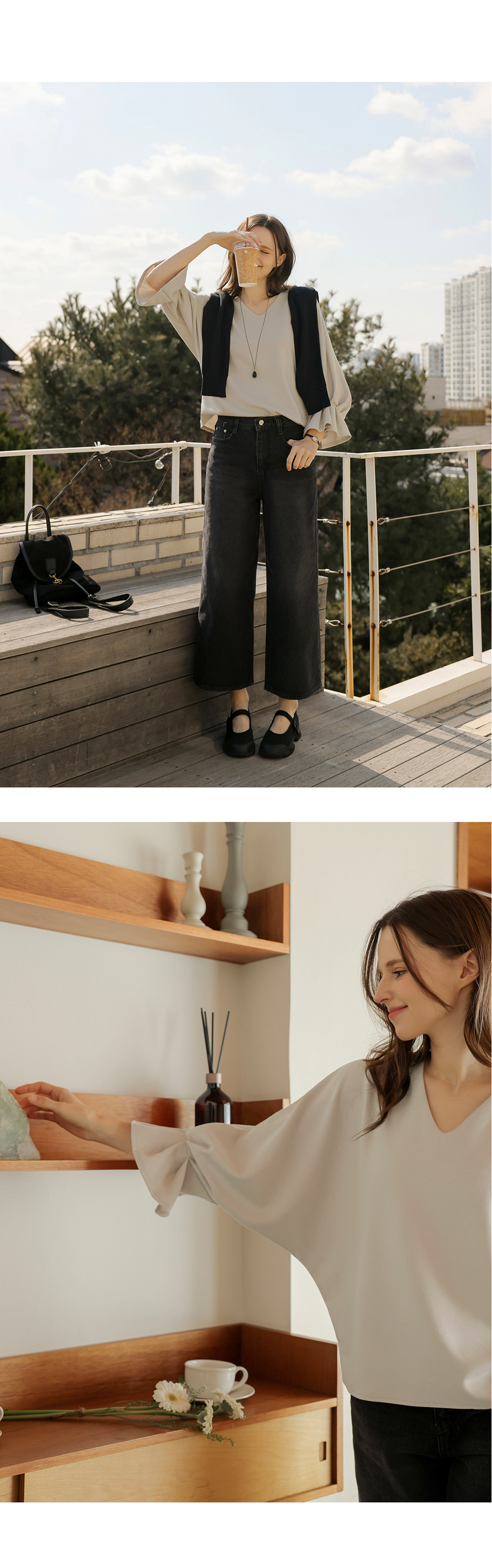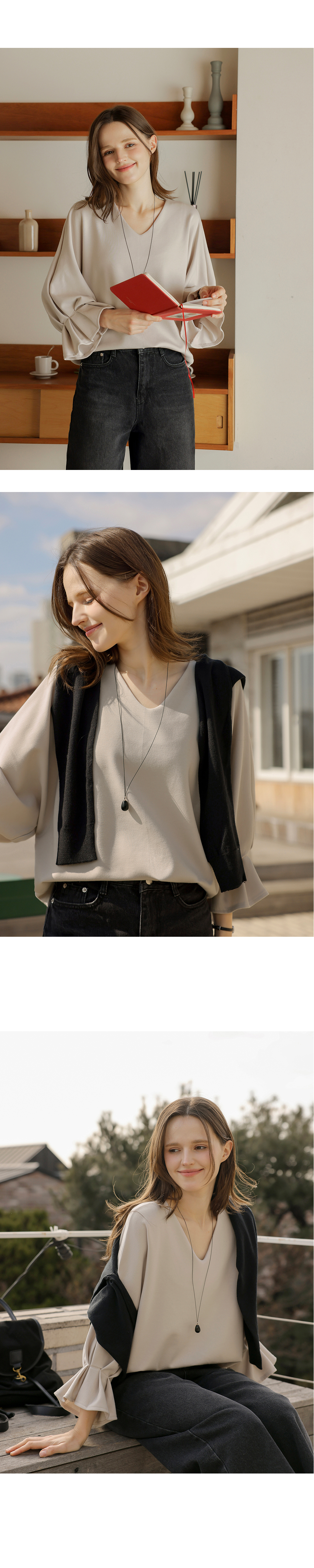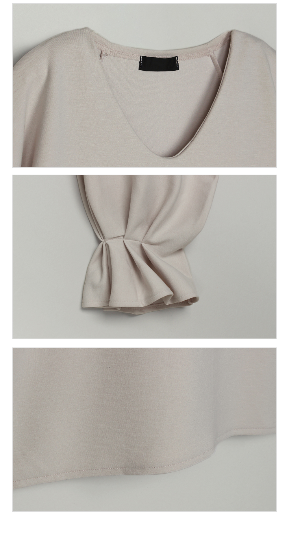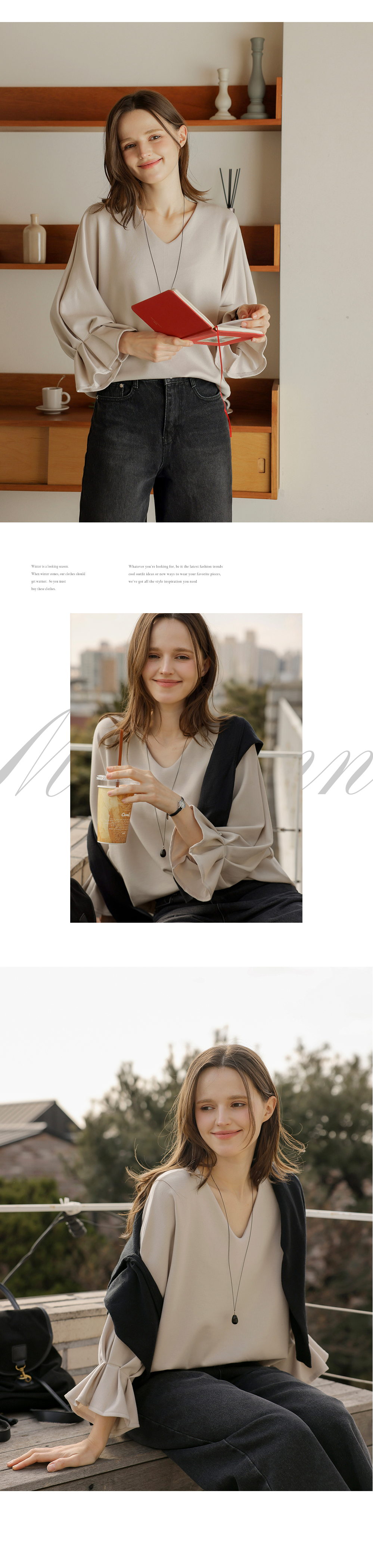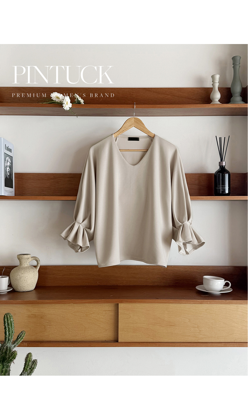 韓國製荷葉褶袖優雅V領長袖衫(黑/白/米/灰)