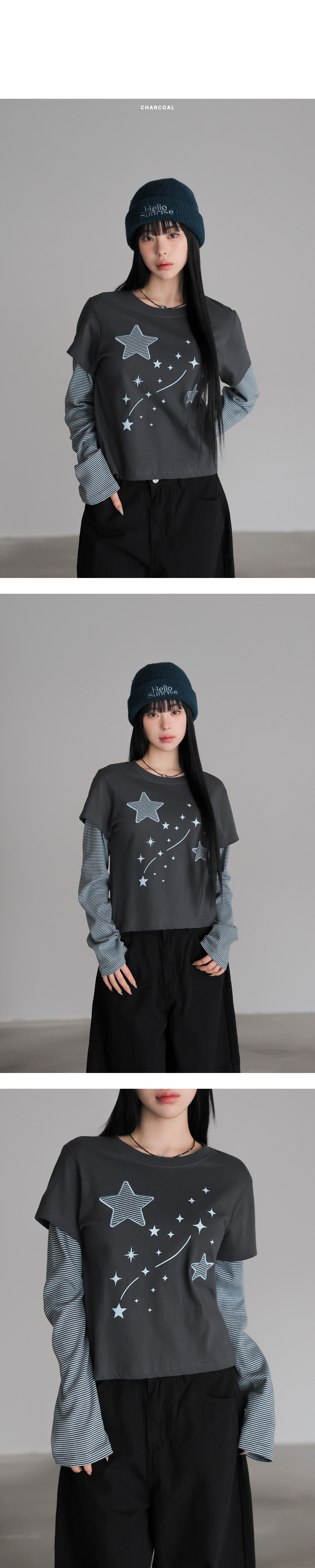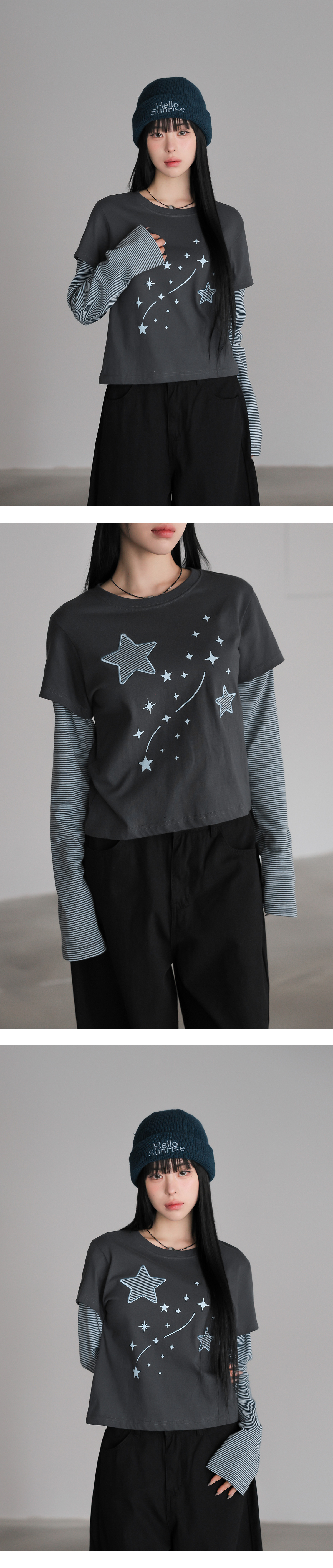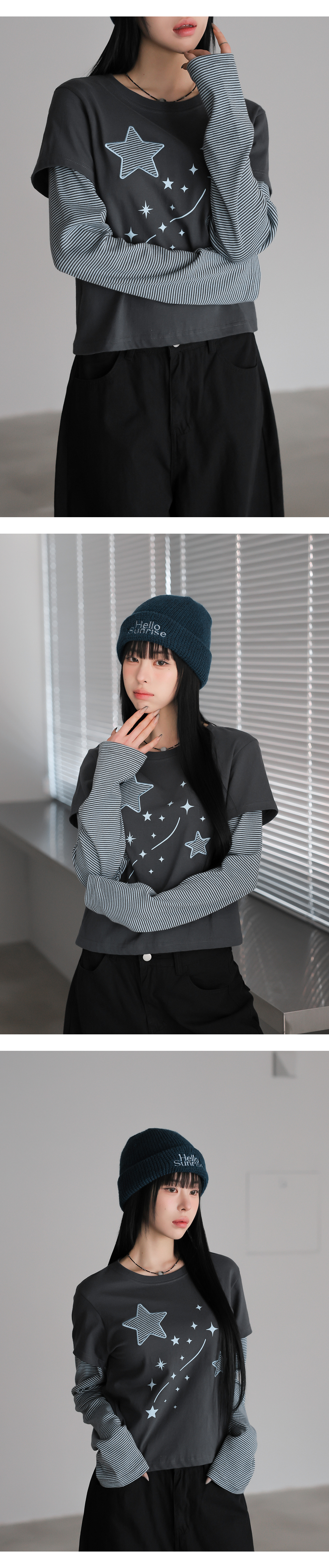 韓國製假兩件星星圖案長袖(黑/木炭/酒紅/燕麥色)